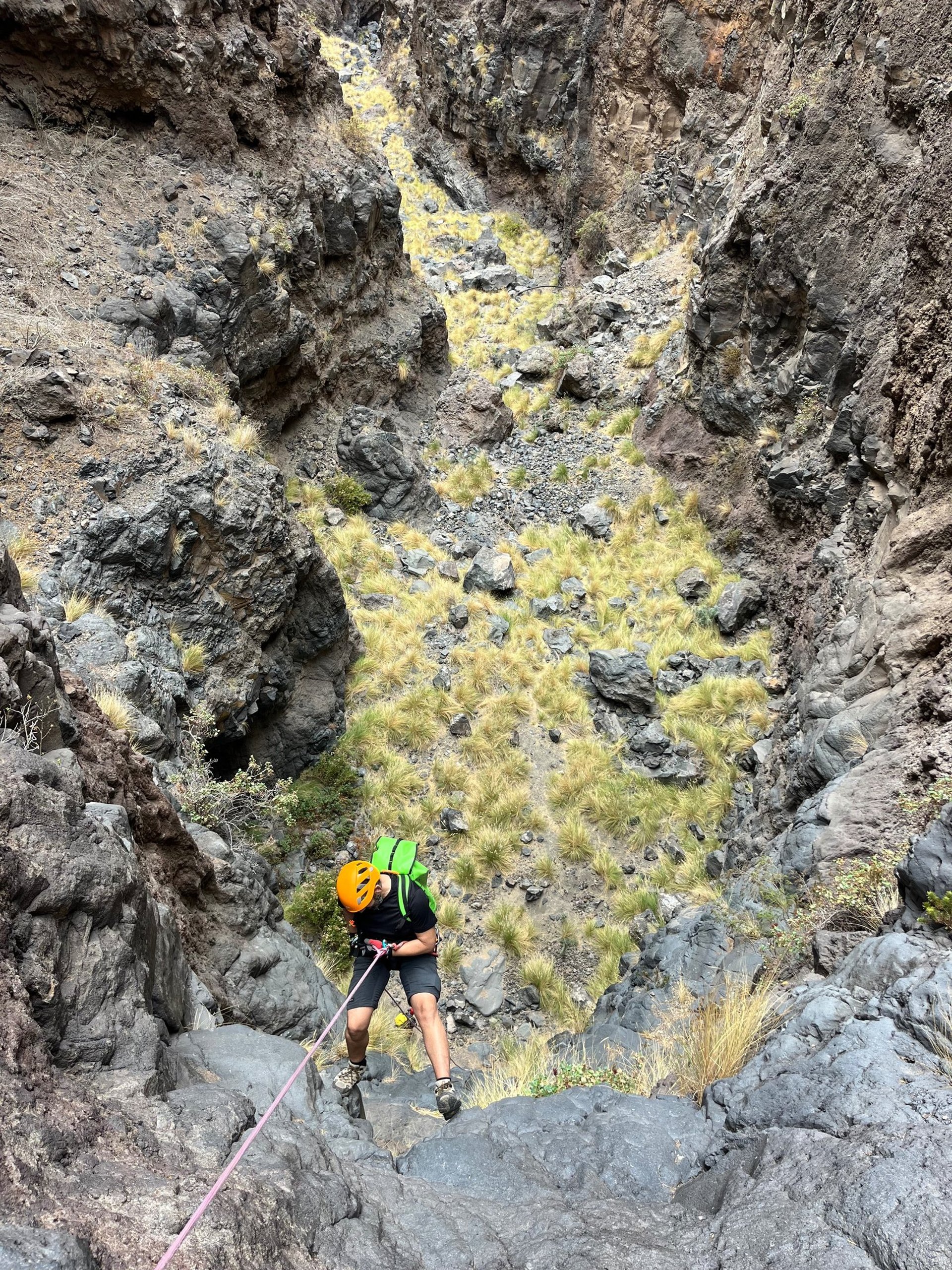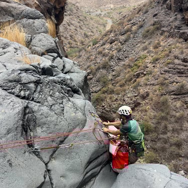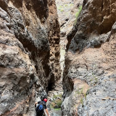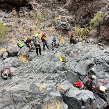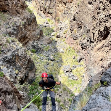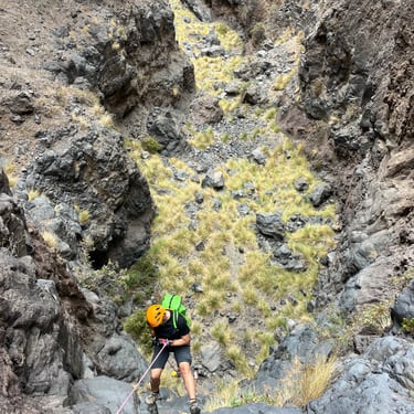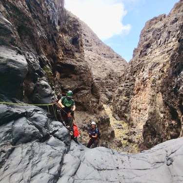 .Canyon Rey Inferior is one of the most demanding canyoning routes in southern Tenerife, located in the Arona area. Designed for expert-level canyoners, it features vertical volcanic walls, technical anchors, and abseils of up to 60 meters. This route combines exposure, precision, and raw volcanic beauty — making it a true challenge for advanced canyoners, guides, and adventure professionals seeking Tenerife’s most intense descents.