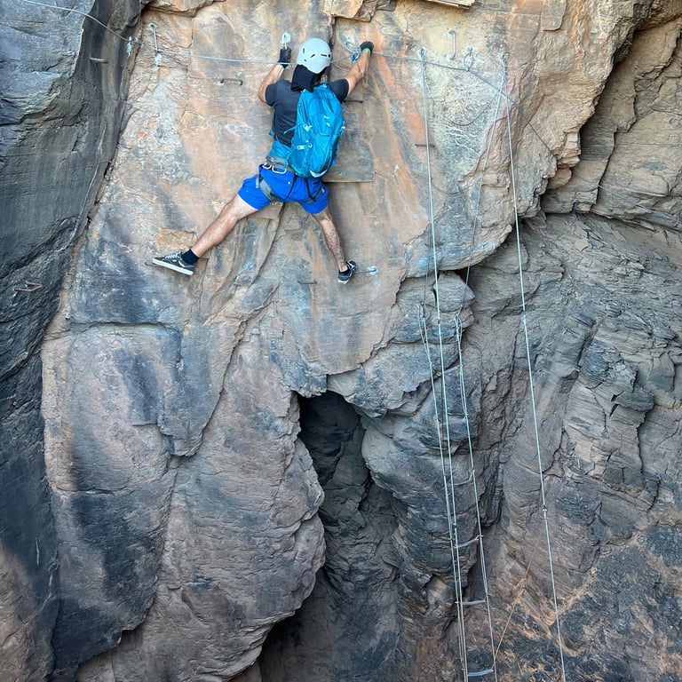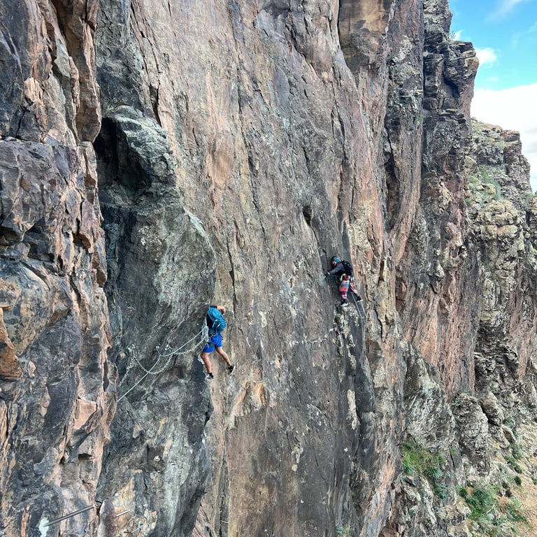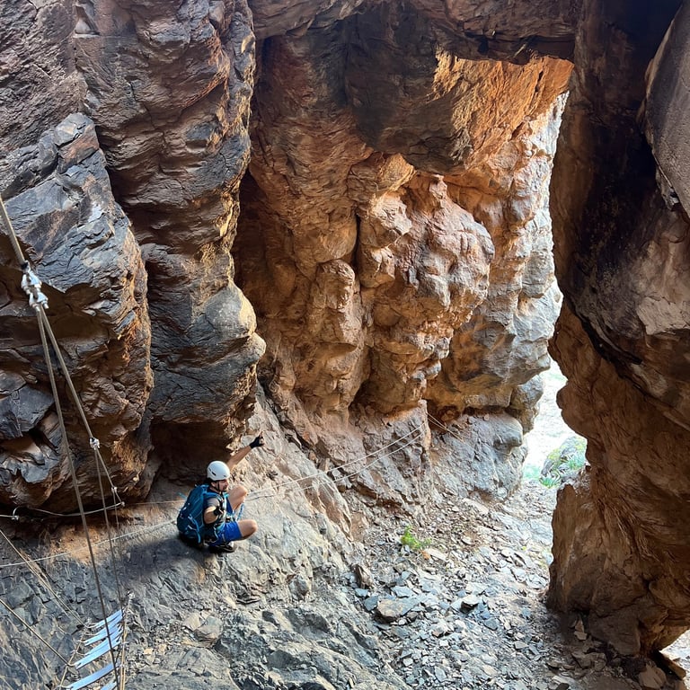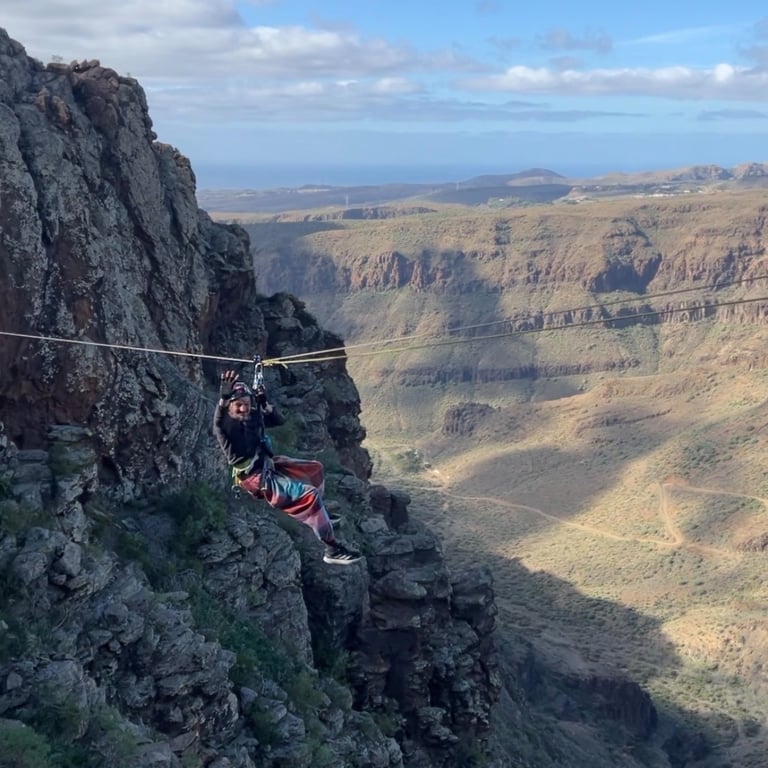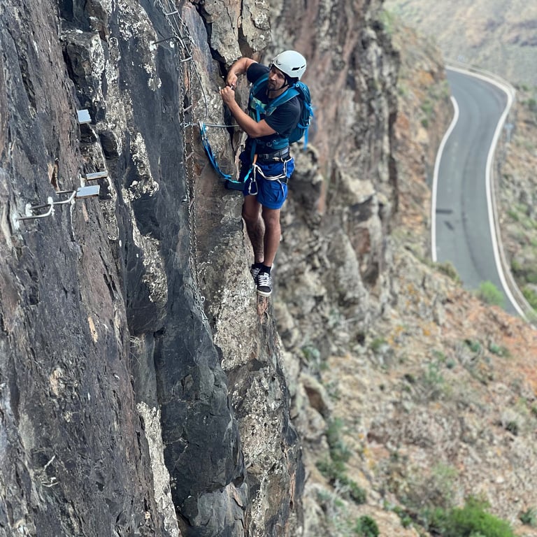 The Via Ferrata near Fataga in Gran Canaria offers an exhilarating adventure through the island’s rugged landscapes. This half-day guided climb is suitable for beginners and intermediate adventurers, requiring only a moderate level of fitness. Vertical Climb: Ascend a 300-meter-long route reaching heights over 70 meters, equipped with iron step and safety cables. Suspension Bridge & Zipline: Navigate a suspension bridge and enjoy a thrilling zipline ride, adding excitement to the climb. Cave Exploration: Discover hidden caves along the route, enhancing the adventure with unique geological features.m